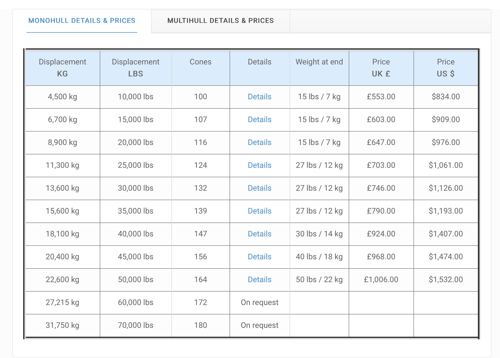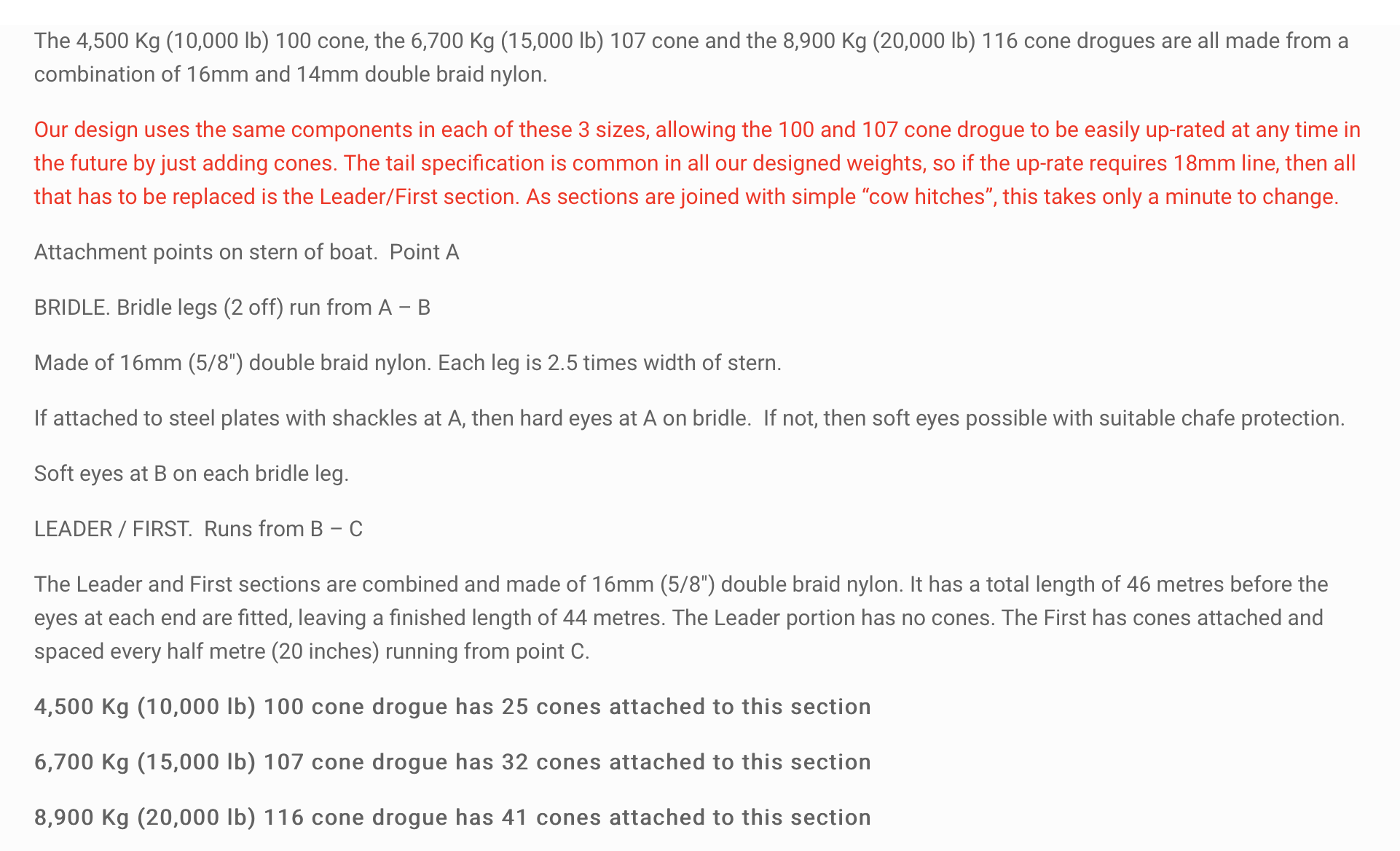 As we can see, the most obvious drogue to choose is the 116-cone model specified for boats up to 20,000 lb and Angus confirms that he is near certain that was the one he sold to Susie: