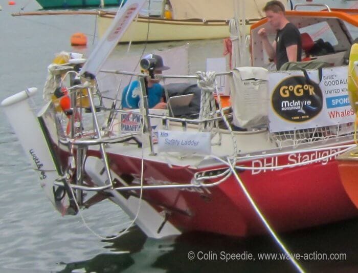It’s hard to tell, but the boat does look well laden down in this photo and this one, as well as the shot above that Colin took before the first start in Falmouth, which substantiates my analysis above.