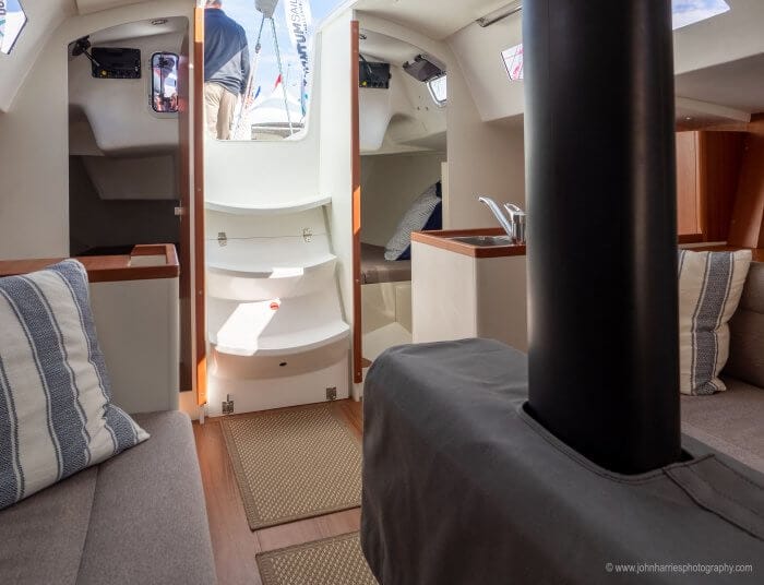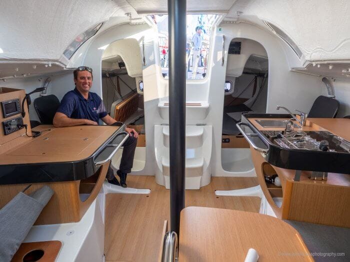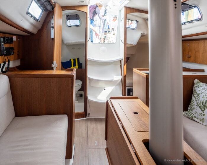 And it’s not just about racing either. Here’s the very nice interior of the J97e that would serve a young family well for weekending, or even a week or two coastal cruise.