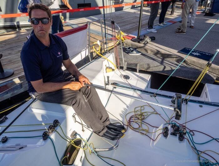 This guy modelling the very well-thought-out steering position—check out the adjustable foot rest and raised area to stop boarding water washing around your butt—has the enviable job of looking after the boat and campaigning it in double-handed races—the target market—around North America. Talk about a dream job. He and I kind of bonded as us 505 sailors do.