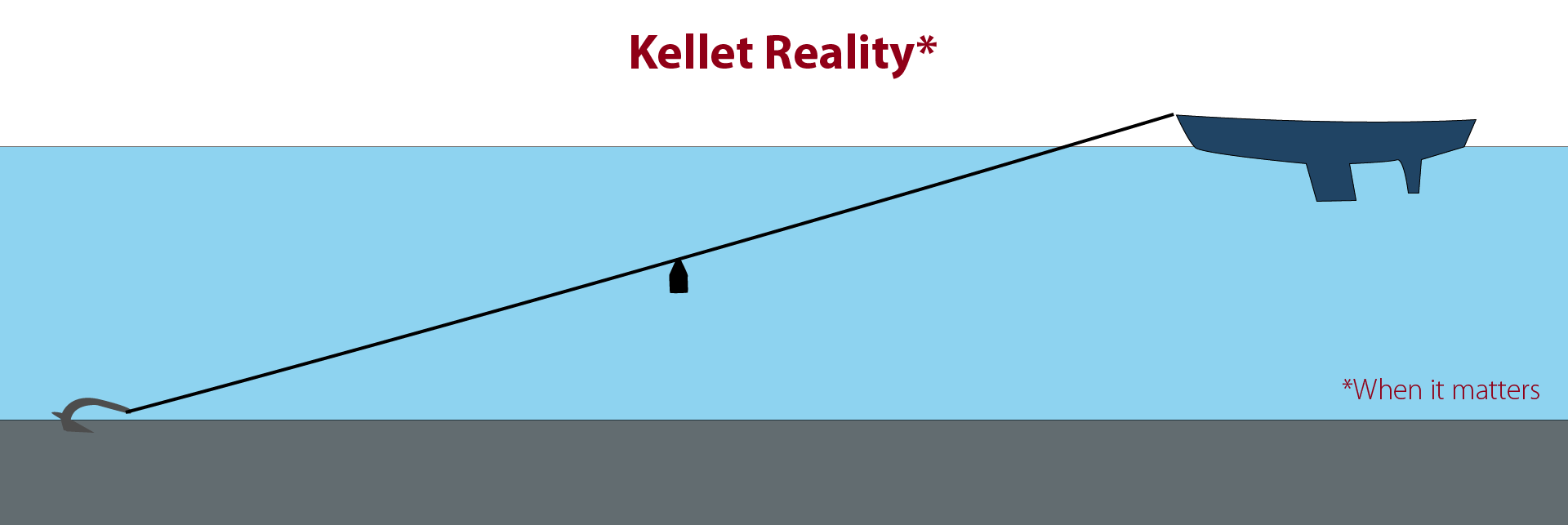 I hear you, but we are not trying to define this from fundamentals, but rather in comparison to a know real world situation that we already have the math for: chain weight (see further reading). So, for our purposes the force multiplier will be close enough between chain, and rope and kellet, to make the comparison valid, particularly since we are talking about a maximum kellet size that is 10 times less than a weight of chain that we know makes no appreciable difference. Also note that a 35kg kellet would be totally impractical to handle. In the article I discuss a 35 pound kellet or 16 kg.