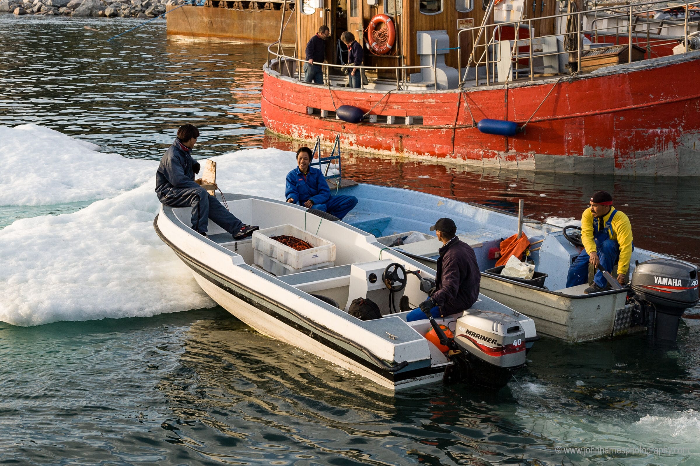 The skipper and I were trying to keep a couple of growlers from banging into the boat, but every time we pushed them off they would drift back. We were just discussing putting the RIB over to push them further away, a big hassle at 10 at night, when these two fishing skiffs turned up and did the job for us.