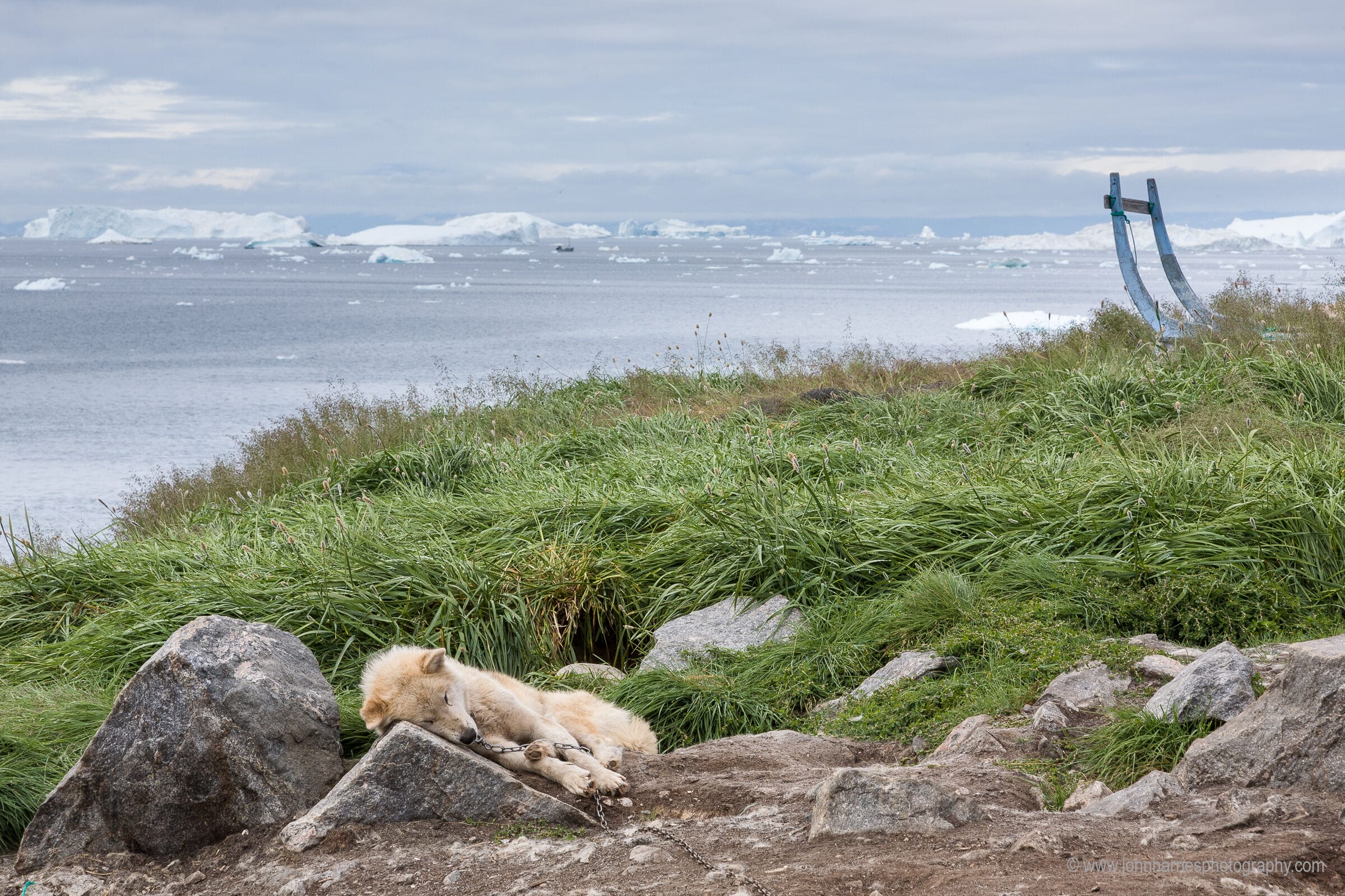 I took the above on the same voyage, also in Ilulissat. I call it Waiting for Winter. To me it tells the whole story of the hard life that Greenland sled dogs lead. Chained out all summer with a rock for a pillow, with their working winter represented by the ice in the bay and the handles of the sled that they will pull.