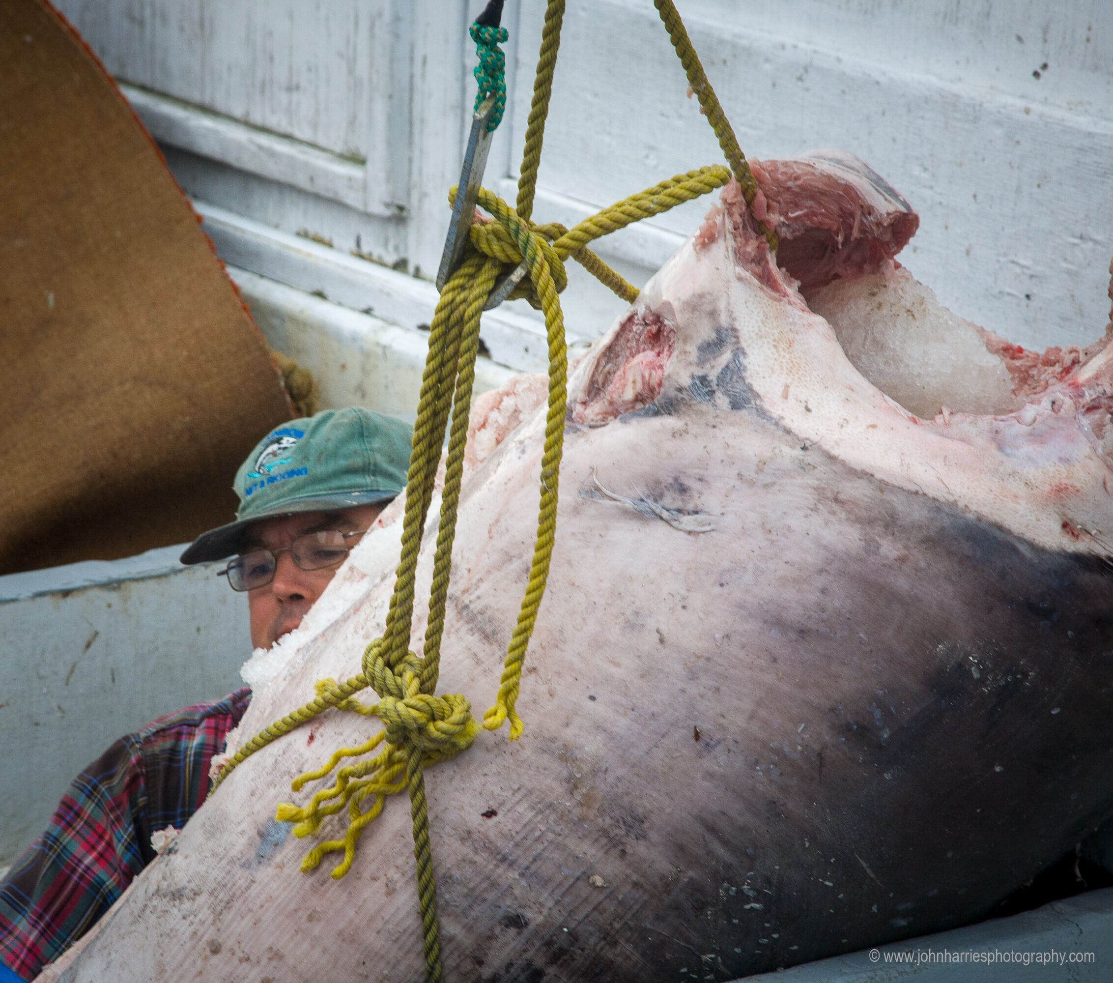 But even then the derrick strained to lift the load, so the same still-dripping fisherman grabbed the tuna in a bear hug and assisted the derrick with a massive heave—as someone who has suffered lifelong back problems, all I could see in my mind’s eye was compressing disks.