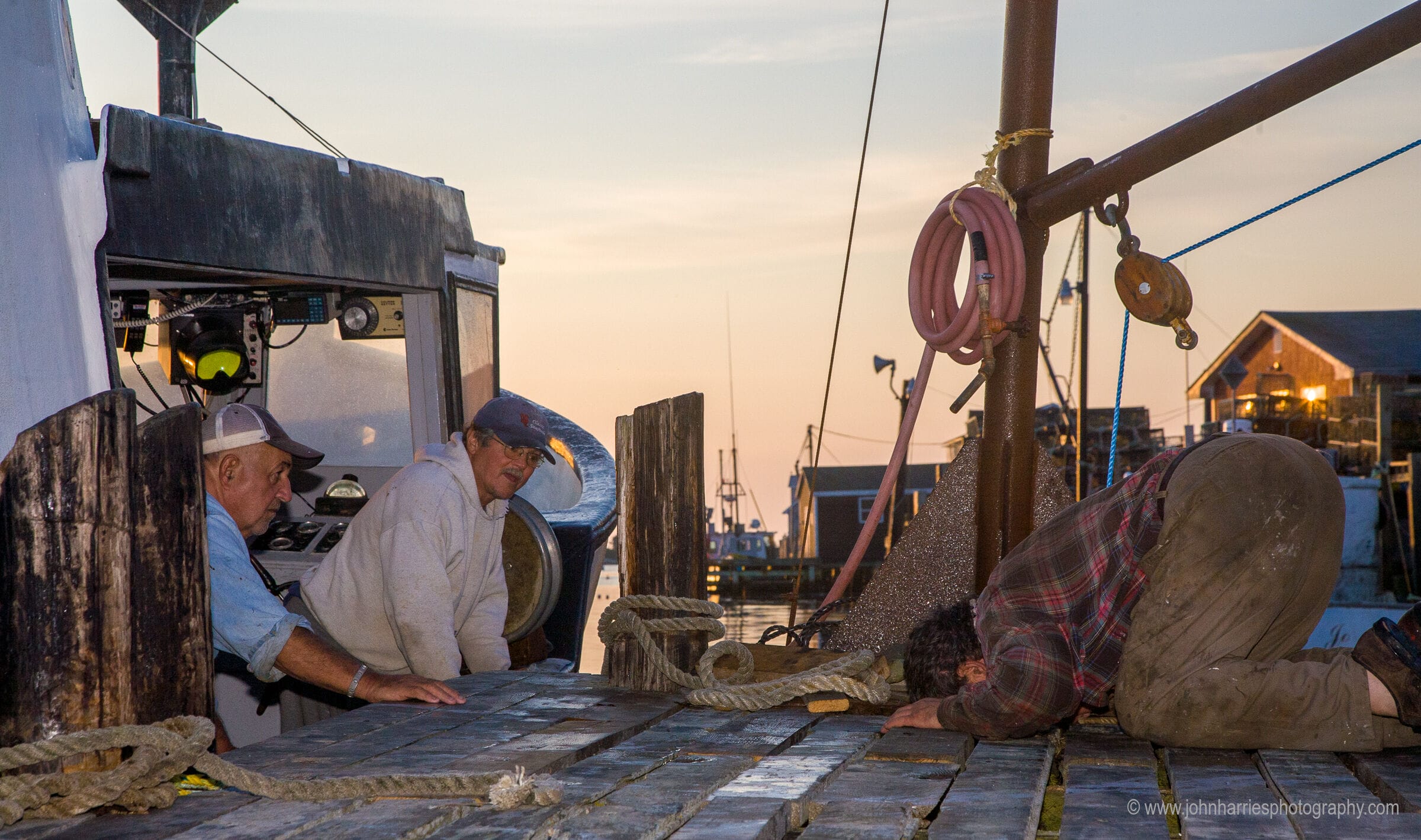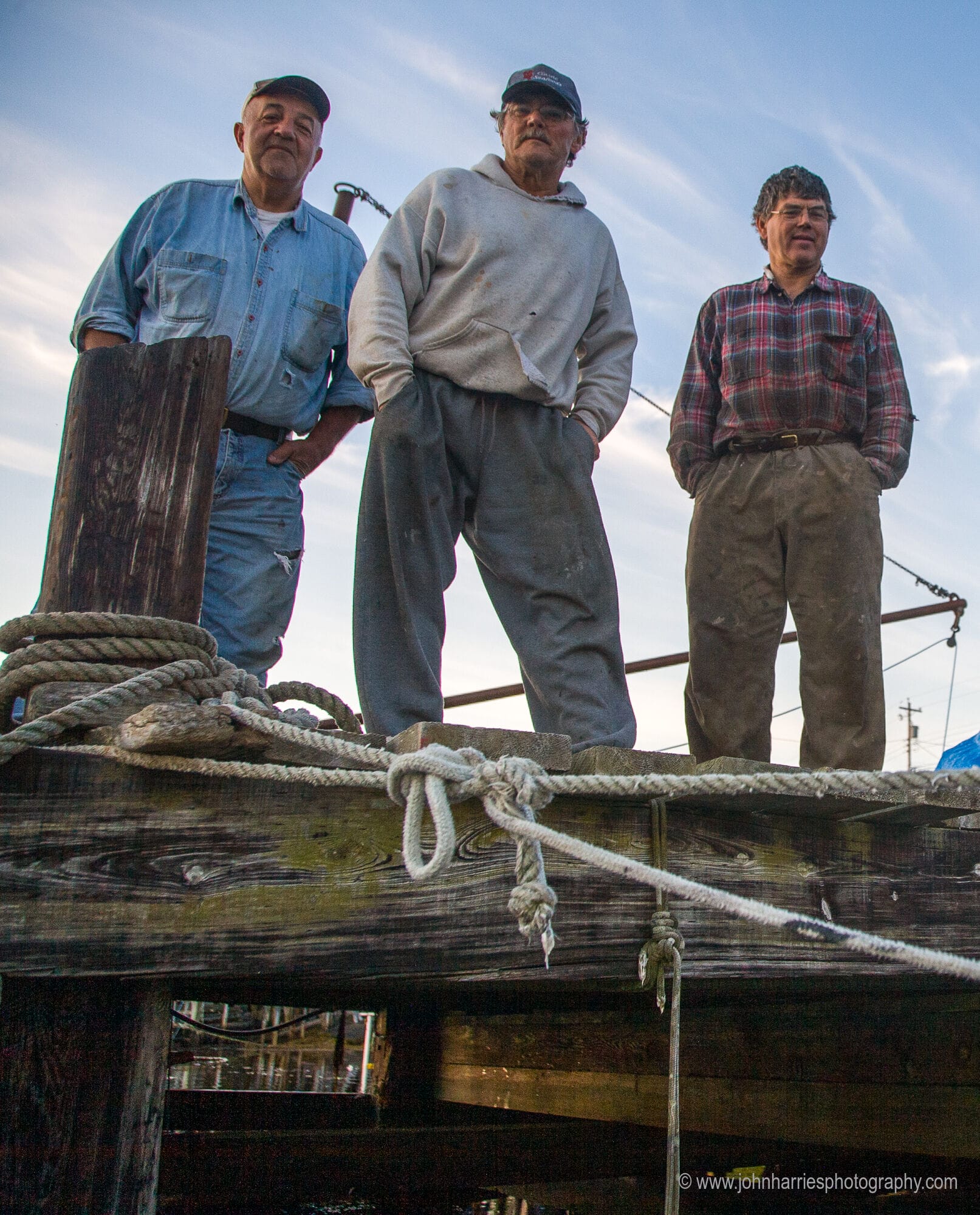 First the wire slipped off the sheave under the wharf, so the youngest guy jumped into the chilly water up to his nuts to jam the wire back in place—not young but still plenty tough.