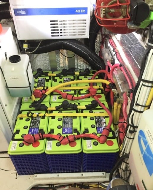 Form factor dictated our choice to stick with lead-acid batteries as much as any intrinsic chemistry or DOD cycling attribute. We could have taller batteries (and therefore a larger bank, desirable to us because of where we could put it under the mast on the centerline) and mount them securely together close to the charger/inverter. We are careful not to go below 70% SOC, which means we should get more cycles out of them than with those with deeper drawdown habits. But I’m under no illusions that others could easily do this on most production boats, and indeed, one of the biggest complaints I get from sailors looking to expand their banks are the difficulties with cable runs and fitting many battery form factors in advantageous places. A final comment is that lead-acid batteries are very widely available; our L-16 Crowns are used in solar installations and a variety of forklifts and can be shipped most places without comment. Their chemistry is exceptionally well-attested and need not rely on manufacturers’ claims, which lean toward the best-case scenario when not actually drifting into exaggeration.