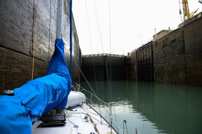 Despite dire warnings of “holes the size of Volkswagens in the lock walls” and “inch-thick rebar sticking out everywhere”, we find our fender board to be nearly unscuffed. Sailor gossip does, indeed, become somewhat exaggerated over the course of two or three days.