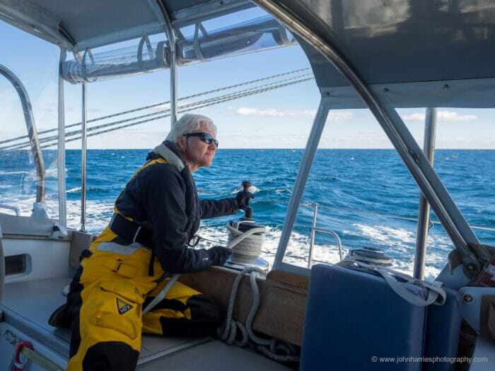 The centre coach roof winch is used for the mainsheet only – not ideal but I’m going to live with it as the easiest solution to get me back into the sea. (The coachroof is low enough that standing astride the cockpit seats we get a good position to operate them.)