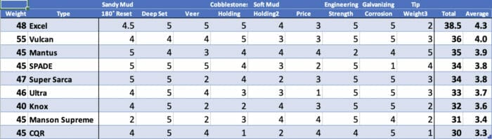 Then, once we have anchors sorted that way, we can crank in some of the other criteria like stability, fast setting, self fouling, strength, etc; criteria that are often far more important than ultimate holding when accessing overall reliability.