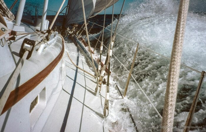 At a rough guess, for every day of voyaging, we worked on the boat for a day. A brutal ratio, but she rewarded us with close to perfect reliability. Only twice in all those years did we have to delay our plans due to a gear failure: