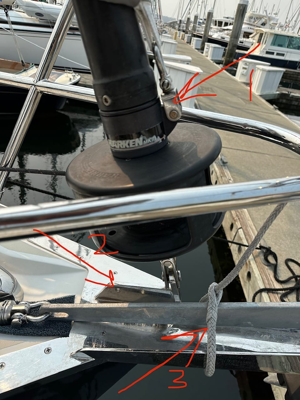 So what do you all think? Is there some configuration option I’m not thinking about? I’m trying to minimize the number of things that need to be done to gybe it and reduce the number of things that can get tangled, etc. I’d be perfectly happy with a fixed length line to #1 or #3 of either of those are sufficient. Or maybe what I’m doing with #2 is fine, I just don’t adjust the line at all and it won’t rub against the furled sail.