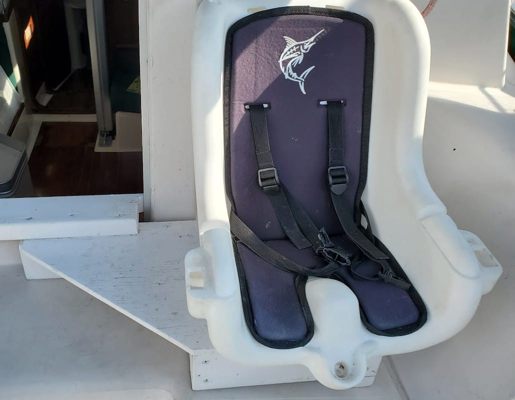 When the children were high-chair age, we had a fixed (to the boat) high chair with a tray in the forward area of the cockpit which we could strap-in our youngest child. He/she was then safe and contained and when there was an “all-hands” drill, we could toss a handful of Cheerios onto the tray. A small handful got us 5 minutes; a large handful got us 10 minutes.