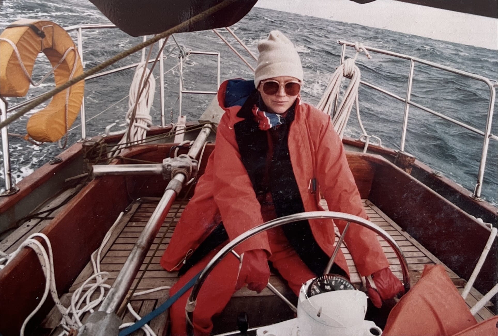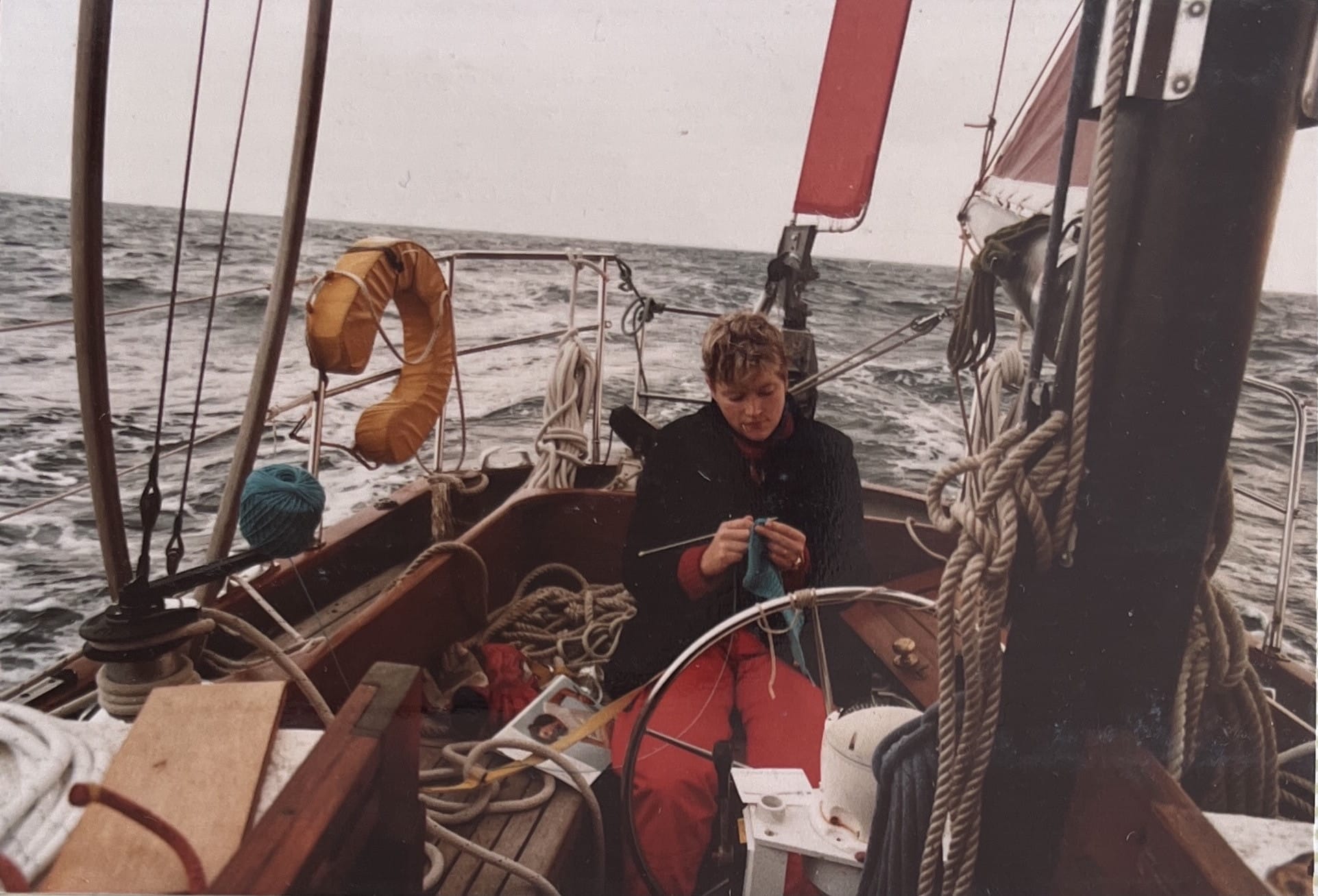 Here’s a photo from October 1983, crossing Biscay, a Hydrovane taking the strain on a ketch.
