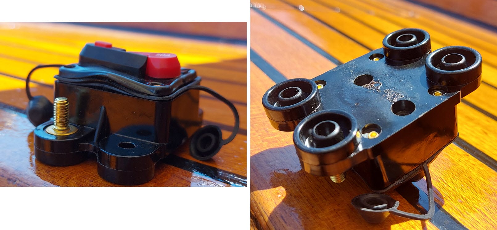 For my two house circuits I had purchased two cheap 50A resettable breakers. Then I made an error in the cabling, producing a direct short circuit, which I initially didn’t notice, however when flipping the battery main switch the aft cabin (where the breakers are located) quickly filled with smoke. The affected breaker did not open but instead started to boil, and more or less welded its internal contacts, making things worse…