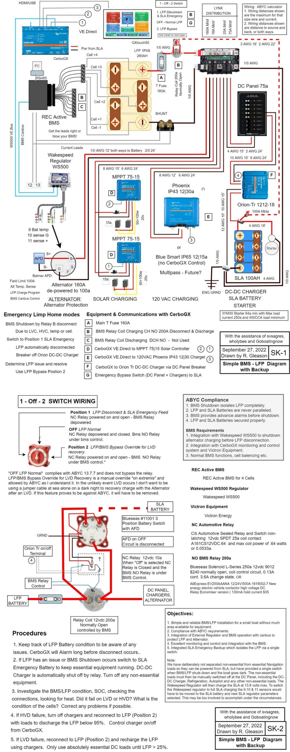 One solution to the Load Dump issue proposed by John on AAC is to have a single AGM battery running the critical systems, with non-critical systems run off a larger LFP bank. The AGM is constantly charged via B2B charger from the LFP bank, with the LFP bank receiving the energy produced by wind, solar, genset and alternator. The system capacity comes from the expensive larger LFP bank, with its attendant complex and expensive BMS and relays. Alternators may be damaged in the event of a load dump, and there is a chance of a voltage spike damaging electronics should the BMS shut down the Charge In relay unexpectedly. There are apparently new devices on the market that may mitigate this potential for alternator damage. Again, more complexity with the risk that their failure could cause cascading damage issues. Installation of a split system like this wold require separating the main DC buses and significant rewiring of the DC the distribution panel. Expensive and complex without redundancy.