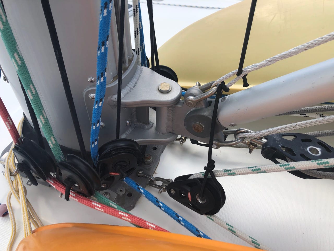 Next we shackle the tack strop at the base of the mast, run the sheets either side of the boom (they are ready in the sausage bag) and run the tri-sail head into the track feeder. Lastly attach the main halyard and tighten the leeward sheet ready.