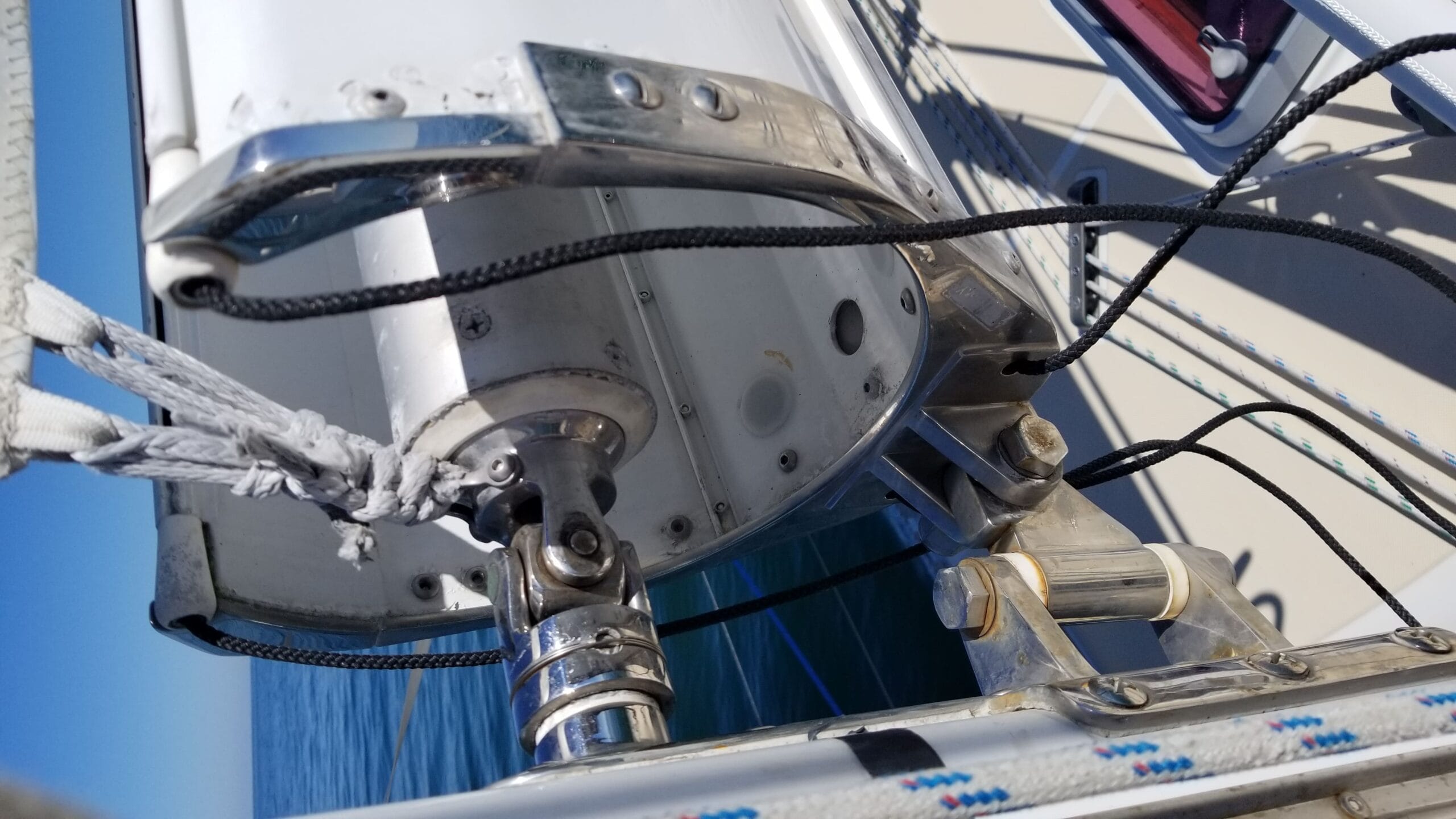 The bolts securing our boom to the gooseneck worked themselves out (see photo) – ours were put in with silicone grease, instead of Locktite. This allowed the mandrel to drop out of its socket at the end of the boom and our furling became inoperable. We were unable to tension the luff or use the mainsail upwind and we had to turn around and run back to our port of departure.