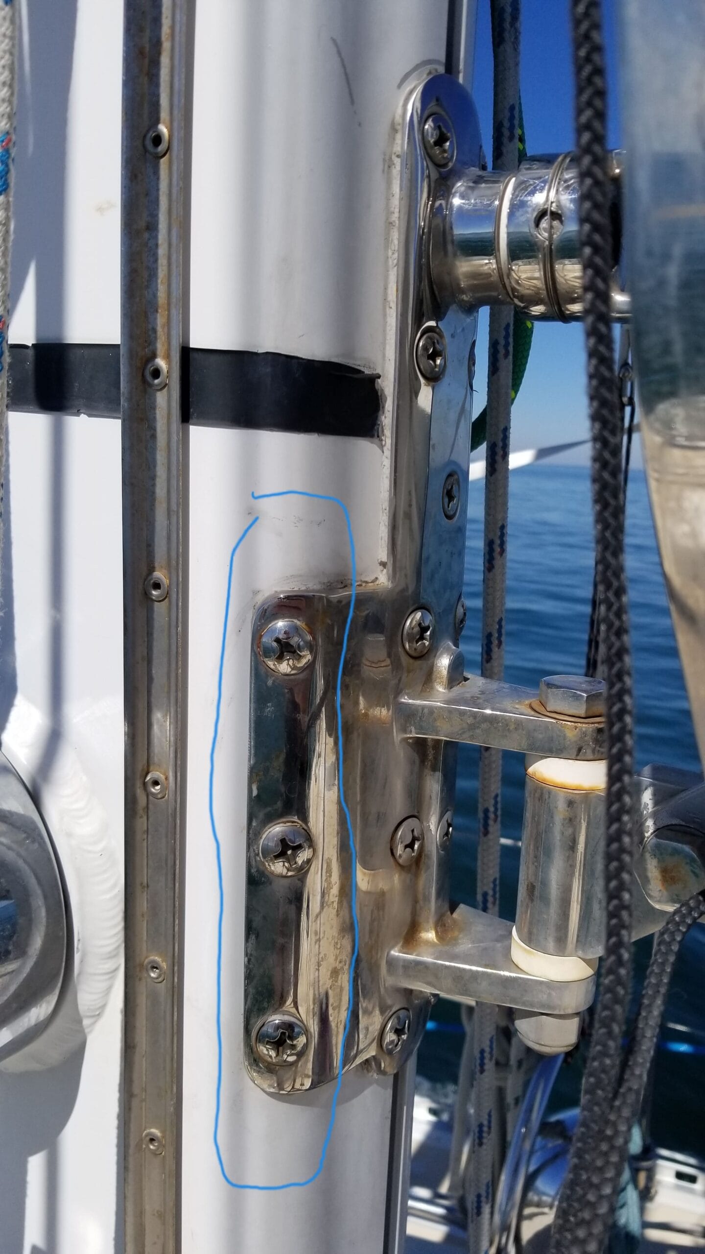 Also, our 2008 gooseneck mast bracket pulled loose from the mast. We replaced it with improved post 2010 design bracket, which added a flange on each side to provide additional screws oriented to converge with the fore/aft screws. Photo attached.