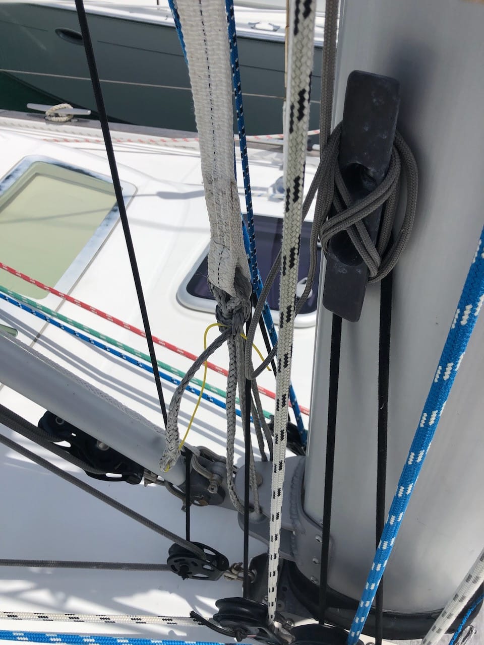 Next picture shows the main halyard attached to the trysail head, awaiting launch with sheets ready .