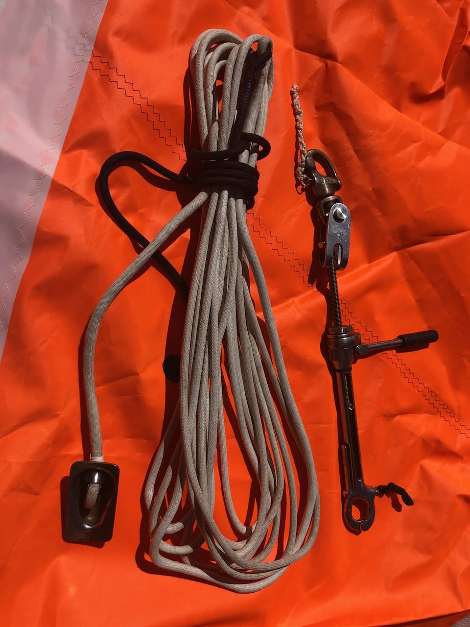 The inner forestay is Dyneema in a sheathed outer hard wearing and shiny fabric, and it’s tensioned with a Wishard ratcheting forestay tensioner that came with the boat luckily ($$$). But we could equally use a Dyneema block and tackle back to a cockpit winch with a clutch I’m sure.