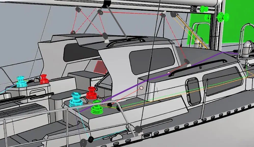 I don’t see any obvious routings for the port and starboard preventers? Same goes for the headsail furling lines. On many boats, these seem grafted-on and end up as trip hazards. It’d be nice to see them fully considered in the design.