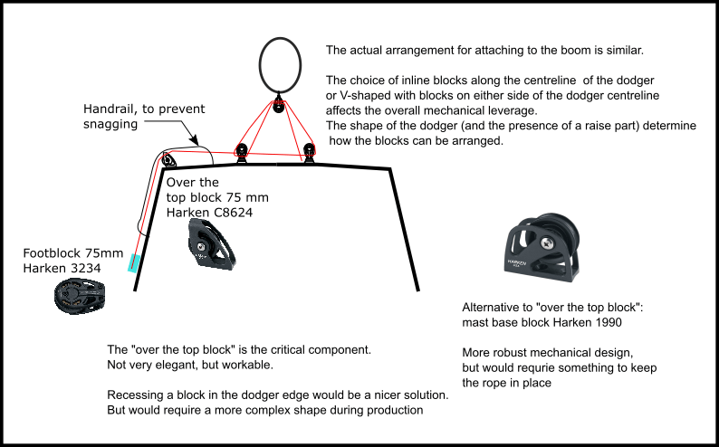 I think it would be possible to reduce the use of footblocks also, by clever design of the shape of the aft edge of the dodger. One mastbase block (instead of two footblocks) could route the rope from the winch up along the dodger side to the top.