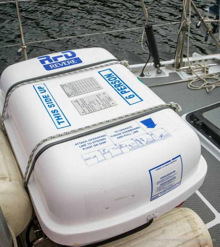 We purchased a Viking RescuPro six person life raft at the Miami Boat show in 2014 for our new to us boat. We purchased the Solas A and the additional >24 hour ditch bag that was required for the Route Halifax Saint-Pierre Ocean Race that we completed in 2016. We have had the life raft repacked three times in it’s lifespan at Sea Safety International in New Jersey. We always stay for the inflation and initial raft inspection and to see and remind our aging selves how we would enter it in a real life situation. We keep it stowed on a custom built stainless cage on the aft of our center cockpit combing. To deploy we need to release (or cut) a cam strap holding it in place and push/roll it after down the sugar scoop swim steps. On each repack we keep a collection of the “expired” water and food rations in another ready ditch bag to be used in super emergencies in the life raft or onboard if things really go south. So far, never used it and hope to never use it.