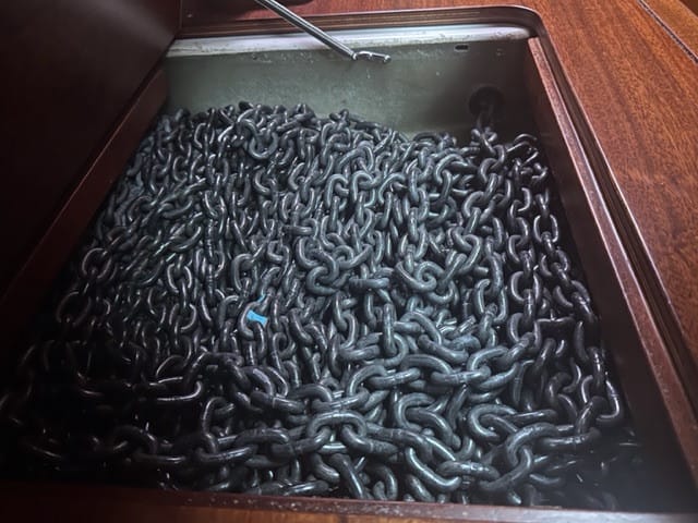 Passage making, I can pull all but about 40 feet back to the bilge and the 77-pound Spade stays on the bow well secured, but easily available at passage end as is the chain.