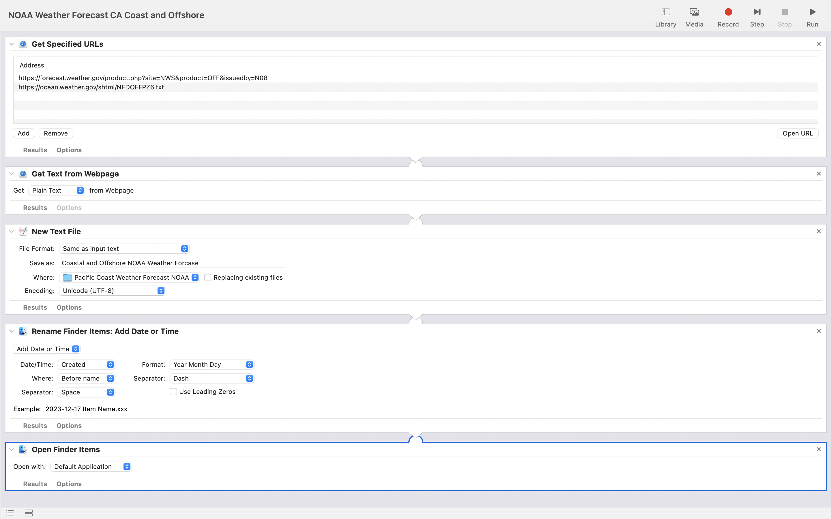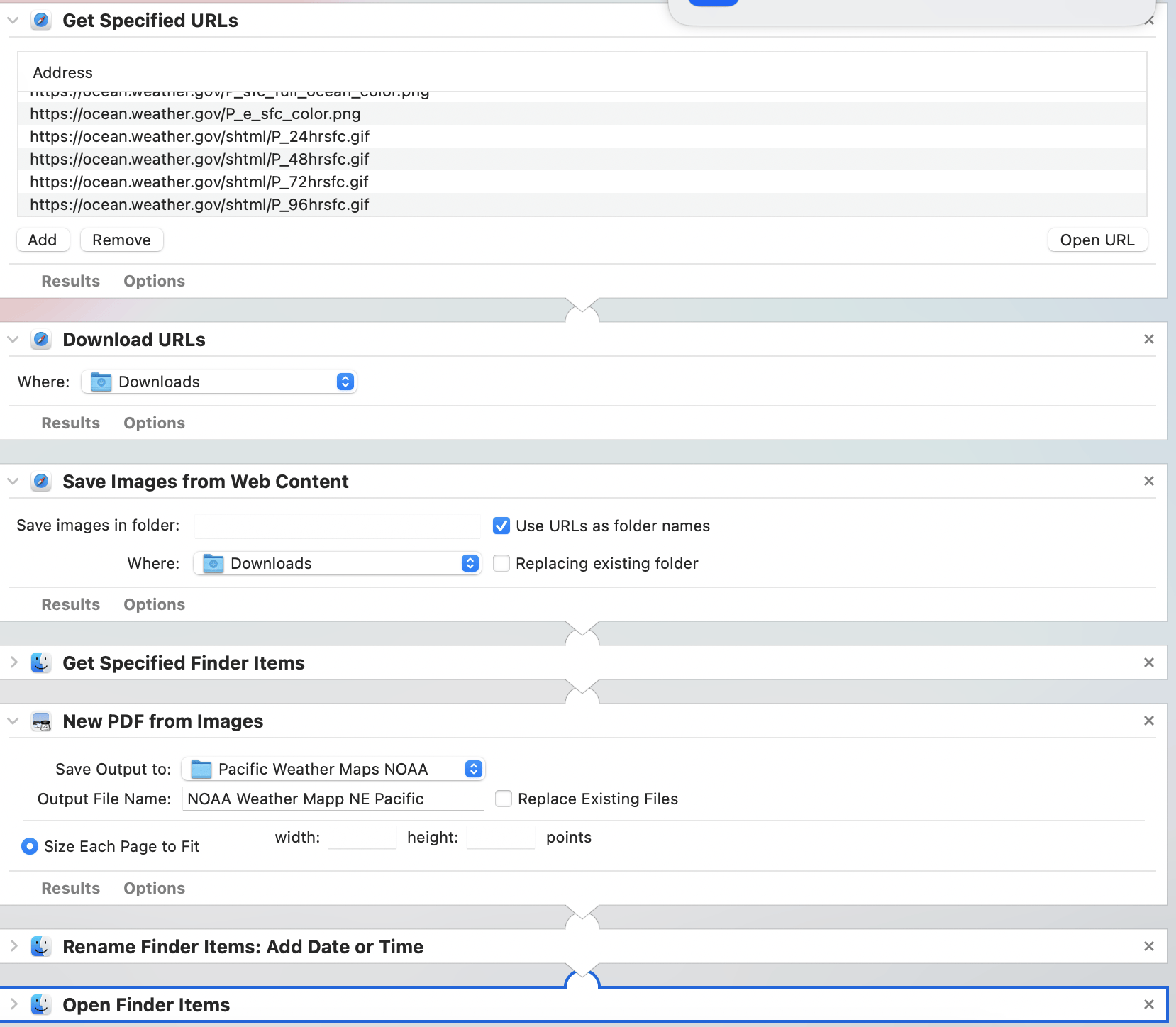 Took a while to figure out how to do this. I’m definitely not a computer nerd. I’ve attached a screenshot of the various “Library Actions” I used to create the Automator work flow for maps. I selected the relevant map URLs from https://ocean.weather.gov/Pac_tab.php.