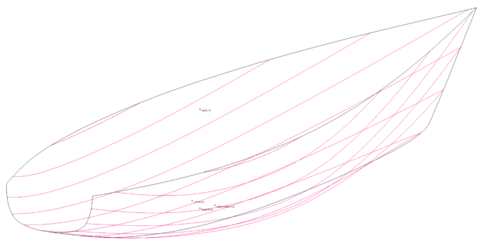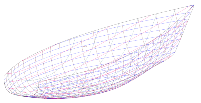 Those three, combined, give us all we need to make a standard 2D representation of the hull. Many designers, though, will now turn the slicer to an angle (usually, but not always, 45°) to also give us the diagonal lines, in pink.