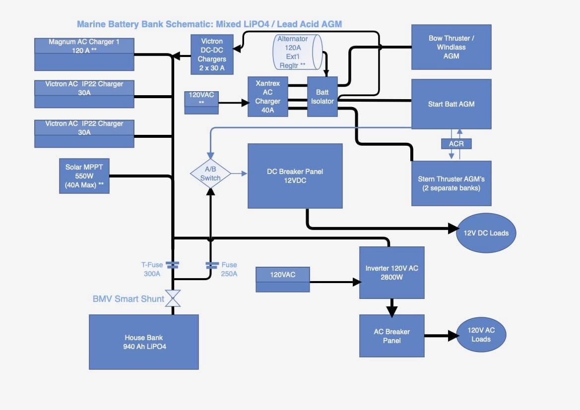 The alternator & a single 40 Amp AC charger charges the lead acid group directly and the house bank gets charged by 2 x 30 Amp Orion DC-DC converters. (This is in addition to 3 dedicated AC house bank chargers totaling 180A +/- ~40A solar.)