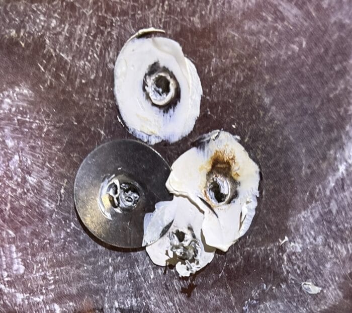 And its gets really ugly underneath. At least Tillotson Pearson had removed the core, so no worries there. But then they had committed an all-too-common crime: Using over-sized washers instead of a proper backing plate.