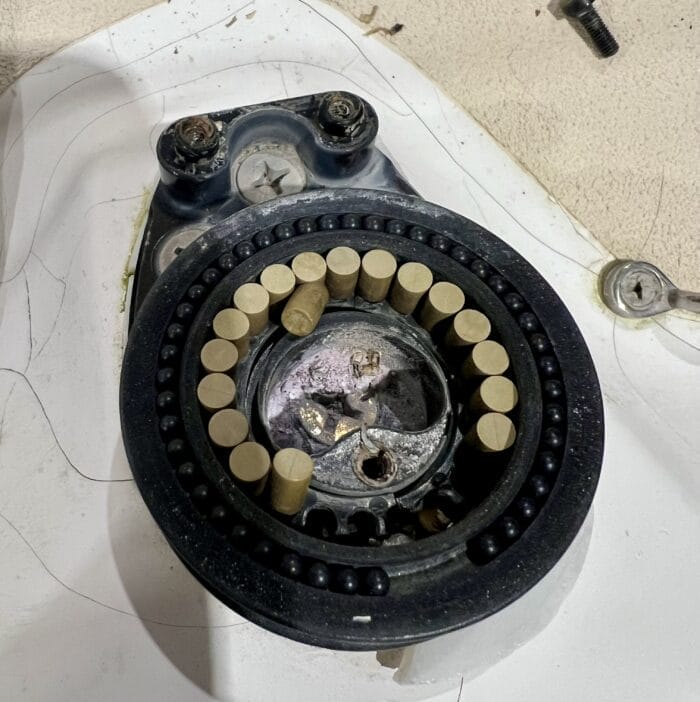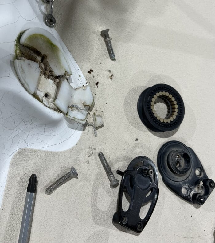 The jib turning blocks were mounted on Delrin shims that had, after 20 years, failed from sun exposure.