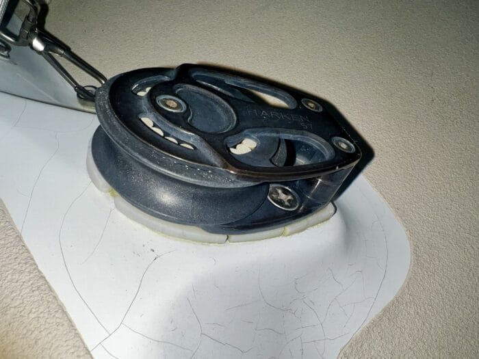 Last winter I mounted several pad eyes and remounted two blocks on our new-to-us J/109.