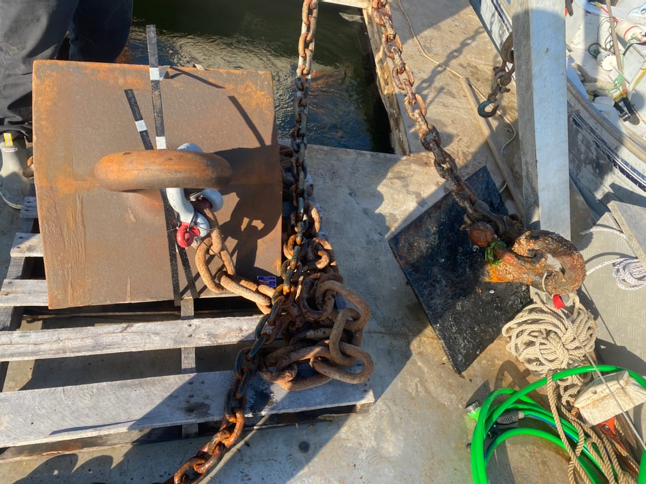 I sure hope that the current cost you got on the Dor-Mor isn’t correct. I have bought 2 and found that buying direct is way cheaper than getting it marked up by someone else. My parent’s skiff sat on a 500lb one from our first cruising boat until 2020 when our changed mooring situation for our boat caused me to upgrade that mooring as a storm mooring for us. In 2020 Dor-Mor quoted $2300 for a 1000lb unit and $4800 for a 2000lb one. The shipping was only $125 for the ~3 hours each way of driving so I actually did that rather than going to pick it up. I am a big fan of these units although I am a little cautious around the holding power claims as they appear to be based on a single test. They are widely used with great success so that gives me the confidence to use one but I only count on half the holding power which is kind of like a safety factor. If you use their charts, they use the ABYC numbers for loads which have a ~3X+ safety factor so it is still a little conservative even if you cut the holding numbers in half. I would be a little nervous using one of these in hard sand as I have seen ones in hard sand around here that are not fully buried even after 6 or more months but in all other bottoms they bury quickly. In our case, I know that the top of the eye on the 500lb was ~2′ under the very hard mud after a single year. To me the great thing about these is that they work in most bottoms whereas mushrooms work great in very specific bottoms but work pretty poorly in most others. After hurricane Bob where all the mooring near us were mushrooms, who dragged and who held was almost entirely bottom based. The bay here changes bottom type quite rapidly and some areas with the perfect mushroom mud had way undersized gear and did fine but 100′ away all the boats might be gone as it had gone too sandy and they didn’t bury correctly. One final note on the Dor-Mor is that there are a lot of other pyramids available, most with construction methods I don’t like, different geometry and no holding power data. I would stick to the Dor-Mor exclusively, our 500lb shows basically no metal loss still and our mooring guy says he has seen some of the imported ones rust out the eye in 3 years. Attached is a picture of swapping from the 500lb with 3/4″ bottom chain (actually short link anchor chain) to the 1000lb with 1-1/4″ bottom chain.