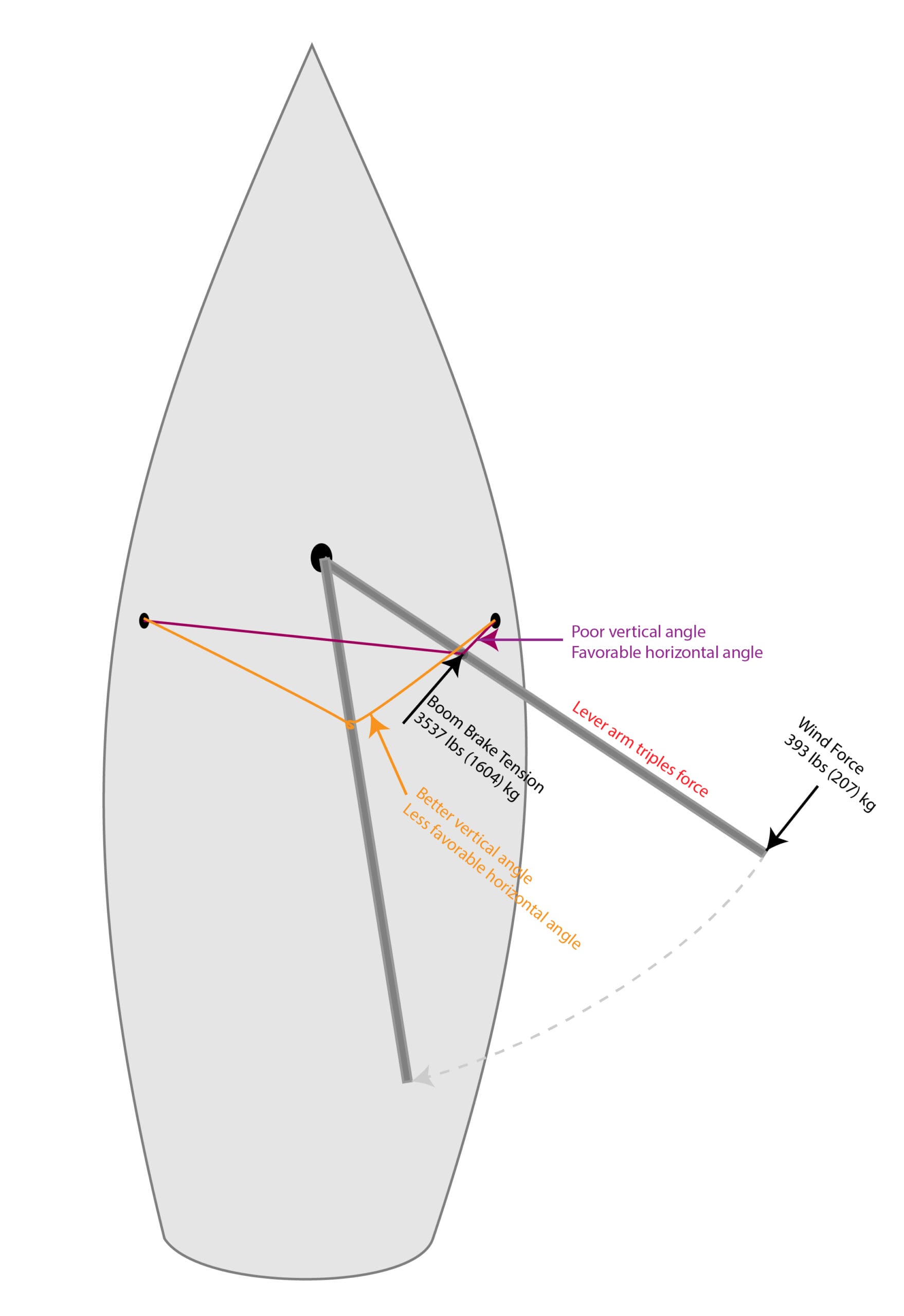 To my understanding, you can rig the boom brake at the same points on the boat where you would rig the preventer. Why, then, should the angles be an issue?