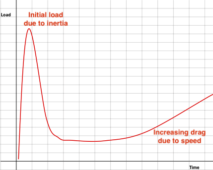 To illustrate why this is potentially a bigger concern than what is the peak load when drag goes to max with speed, think about what would happen if instead of water, you were immersed in, say, semi-solid, thick concrete?