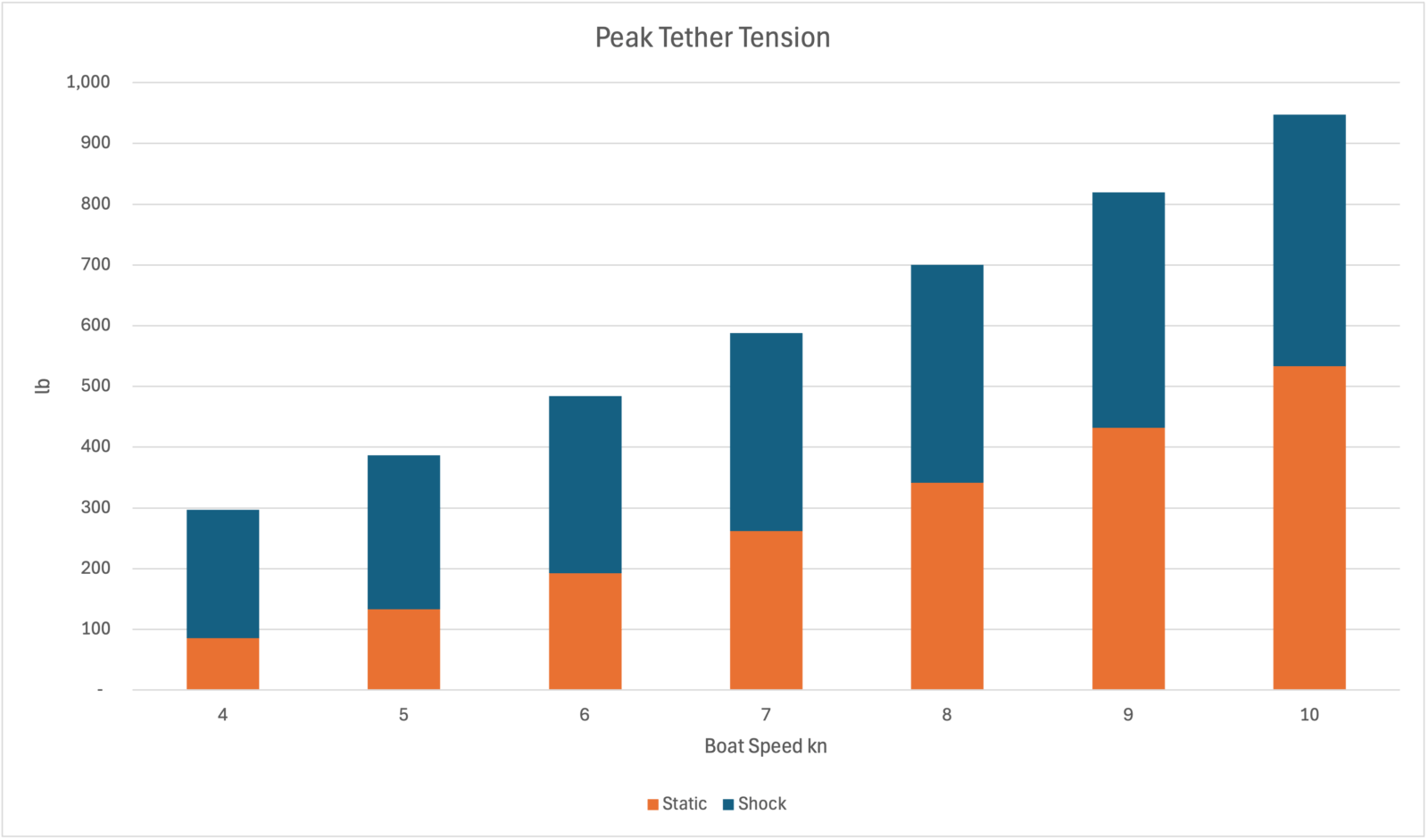 To put a stake in the sand of a way too worse case calculation for what tether tension looks like for simply accelerating a person to 6 knots, I threw together a quick dynamic model. Hopefully the numbers are right, I have given it a quick check but not a rigorous one. Note that this assumes a perfectly rigid person, +50% for added mass, the perfectly bad geometry, etc. so is not at all realistic. As can be seen, there is quite a large velocity overshoot. Your max tether tension will be when the COB velocity equals boat velocity and since this is much higher than the drag, you will have a significant speed overshoot. In real life, with all of the other things deflecting the velocity and tether tension overshoot will be a lot less but still present. If I kept this model going, you would see that it would just oscillate as I haven’t added appropriate damping. I hope no one takes these numbers at face value, it simply gives an idea of what a much worse than realistic case would be and the general shape of the curves.
