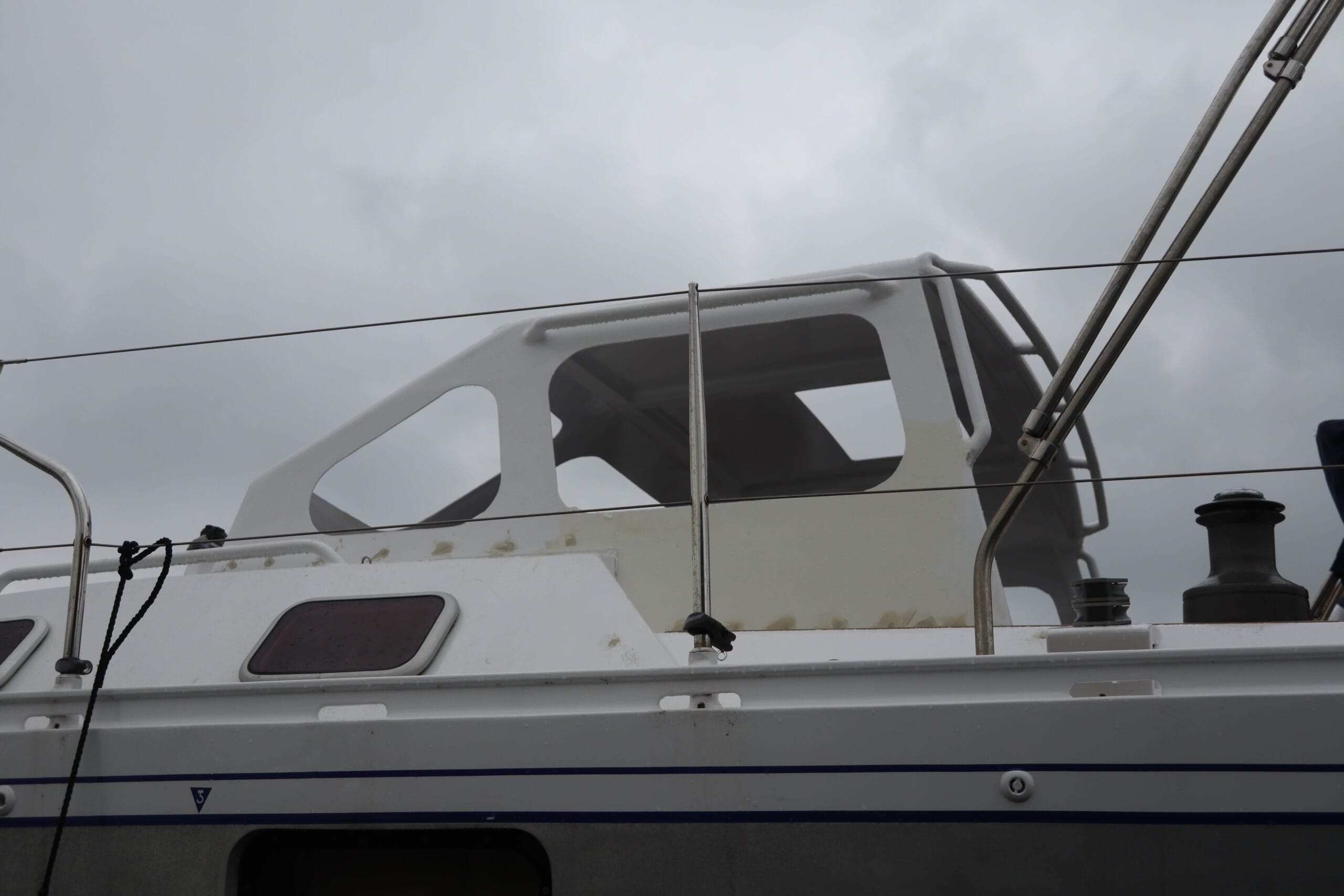 Early on, I made the mistake of running a squeegee over the windows without adequately wetting them after waiting out some heavy weather on anchor for several days. When the sun is really out at a certain angle, I think I can see some fine scratches from the salt crystals. Now I keep an empty squeeze bottle with water and a drop of dish soap in it and give them a good douse before hitting them with a squeegee and it seems to be working great. The boys enjoy cleaning them off and it’s not been a big deal.