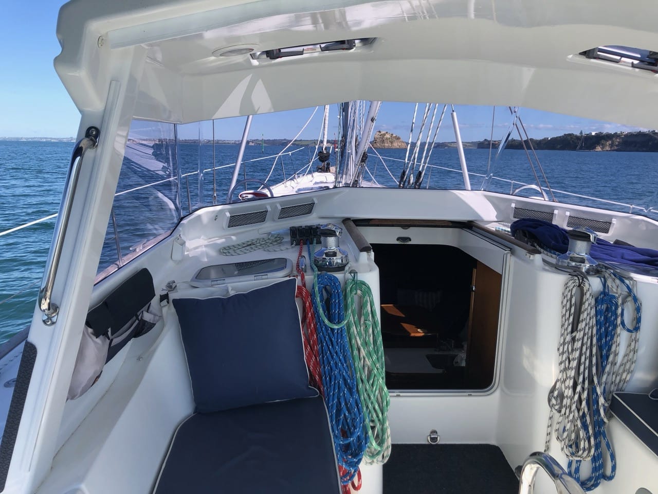 We have had a hard dodger on our Beneteau Oceanis 14.5 metre sloop since 2019. Built in fibreglass over ply – we too went for full standing headroom giving our first-mate better visibility from the aft helms.