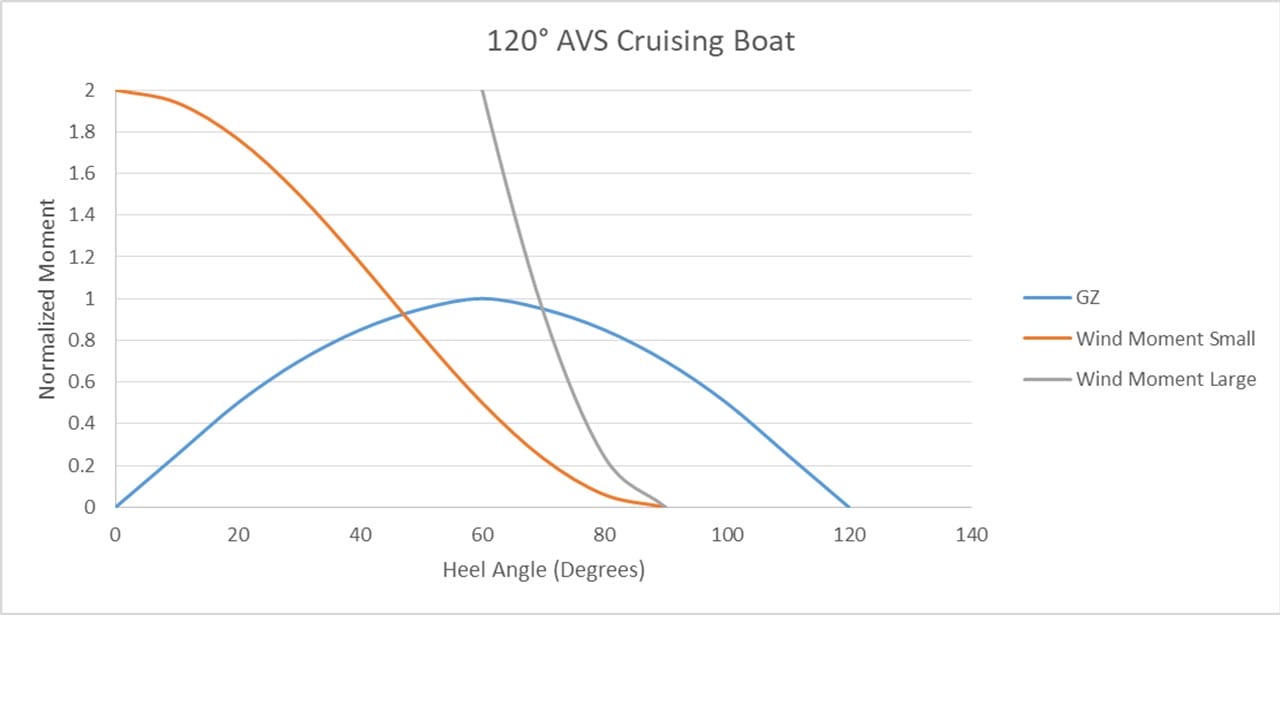 To me, the really interesting/scary thing happens somewhere around 90° heel angle. If the boat has an AVS above this, an infinite amount of wind cannot capsize it (theoretically only as the hull windage is assumed to vanish here which it doesn’t in practice). However, if the AVS is below this, it is always susceptible to a wind induced capsize. How susceptible is due to what the actual GZ curve looks like and how much windage there is.