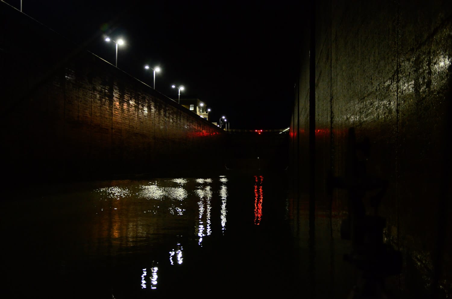 The Seaway can’t sleep until all ships are clear and safe. A small yacht like us will certainly not be allowed to remain within the canal, as long as it’s physically possible to get us out. Midnight comes and goes. We catch another set of lock lines. The water slowly drains away. A kaleidoscope of coloured light plays off the wet concrete walls as sodium lamps, mercury lamps, LED lamps, and signalling lamps compete for dominance.
