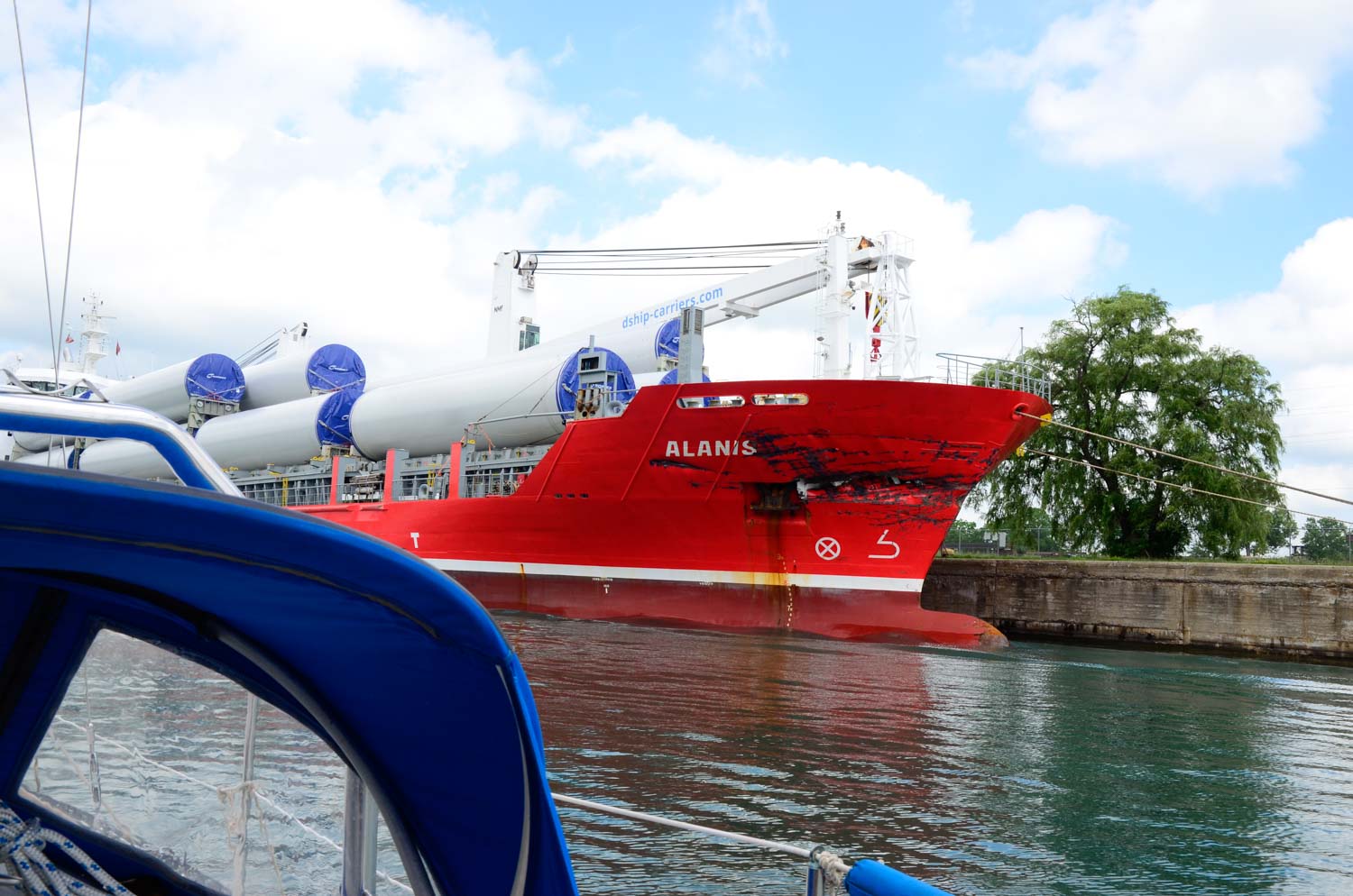There’s a strict no-anchoring, no-mooring rule along here, with one exception: a damaged ship needs to get the hell out of the active waterway, like, ASAP. We pass the Alanis, stacked high with wind turbine tower segments, a large gash across her starboard bow.