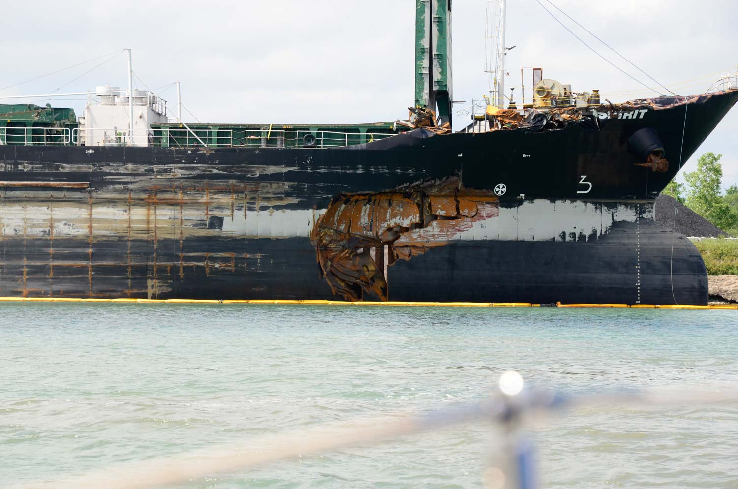 Not long after, the coal bulker Florence Spirit comes into view, her hull split wide open with the fresh imprint of the Alanis‘s bulbous bow. While I have not yet seen the official report on the accident, video taken from the shore shows the coal bulker cutting across the path of the Alanis, her steering gear apparently having jammed to port, then being rammed a few seconds before she would have hit the bank.