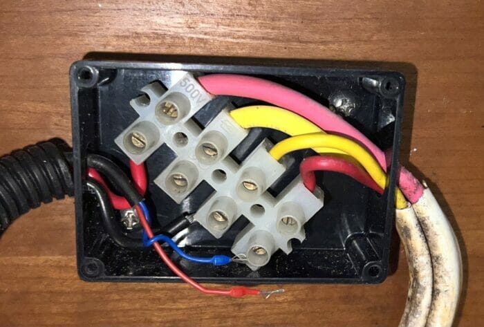 That’s bad enough, but my distress turned to horror when I disconnected the clutch wires and found that whoever had set this up—given the history of the boat almost certainly a boatyard “professional”—had jammed the wires so far in that the screws were on the insulation, not the wire—look closely at the photo.