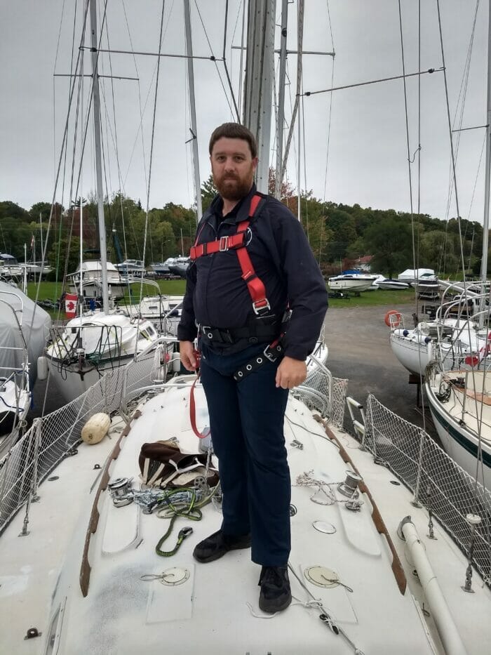 Also, a problem with the sort that Matt is wearing is that they are for falls, not suspension. The leg loops press outwards on the inner thigh, compressing the femoral arteries. You really can hang for more than 5 minutes before your legs fall dangerously asleep. If you are going to use a harness up the mast, it must be a back-of-the-leg design, like climbing and arborist harnesses.
