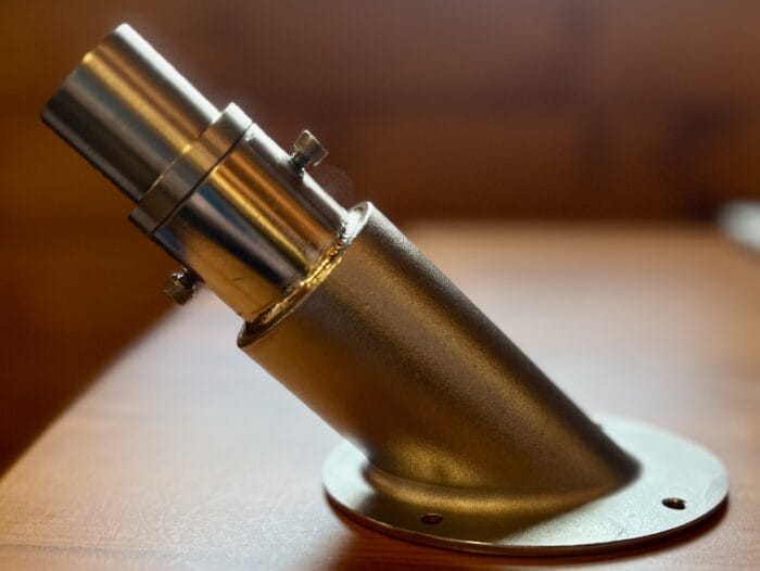 I like the last idea of cutting a pilot block(?) to the needed angle and hot gluing it to the transom. Very slick. I have often used a long pilot bit in a hole saw and eyeballed, (with the visual aid of a sliding bevel gauge), the angle, and drill until just the pilot bit penetrates the material. Then, using the long bit as a guide, mount a block or any handy board that has a hole the same size as your pilot bit on the inside of transom. You should have two pilot holes lined up at this point at the same angle. The aim is to have the pilot bit engaged in both holes before the actual hole saw starts its cut. When cutting through the intended surface with the hole saw you still have the inside guide to keep the angle correct as hole saw undermines the first pilot hole. Sorry for the long winded explanation. In most cases I’d probably go for the hot glue method, but it’s always good to have another solution handy if needed.
