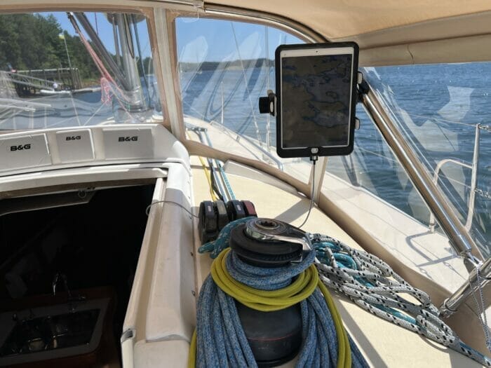 Well, this is better than duct taping it to the companionway, but it still feels like a kluge. Probably OK for round the bay, but I need to make it more waterproof and improve power feed. Even then I’m glad there’s a plotter below for backup and offshore use. Nice clamp from Scanstrut.