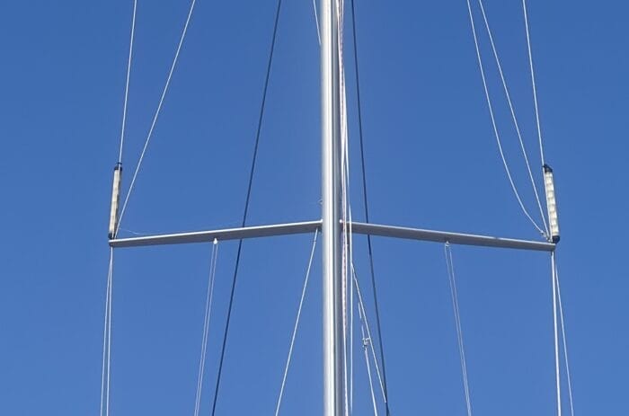 But we still keep those two cylinder reflectors in our bosun’s locker, which can be hoisted to the spreaders, then aligned to vertical using our twin flag halyards. This will help to some extent, especially with vessels approaching from astern where our Echomax will be hidden by our mast. The aluminium mast itself is of course a great reflector, but being rounded in section, will show up only sporadically.