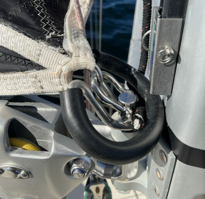 I also wonder whether it wouldn’t be a temporary stopgap for all the boats made with the horrible system of a reefing horn for the tack and halyards at the cockpit which often results in the ring falling off the horn before you get back to the cockpit to crank up the halyard. Of course, the right long-term solution is to make the horns captive and I have done that but it is a pain in the neck.
